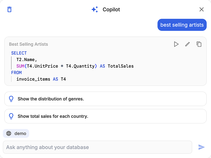 Use natural language to get precise answers from your database. Get prompt suggestions and comfortably explore your data. Generate complex modifications tailored to your database schema.