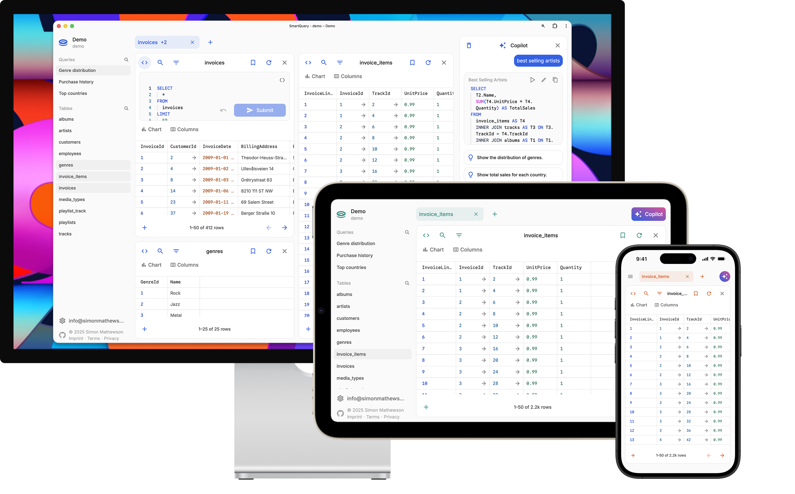 SmartQuery works on any device with a browser, including desktops, tablets, and phones. It can also be installed and used like a regular app, including offline support.