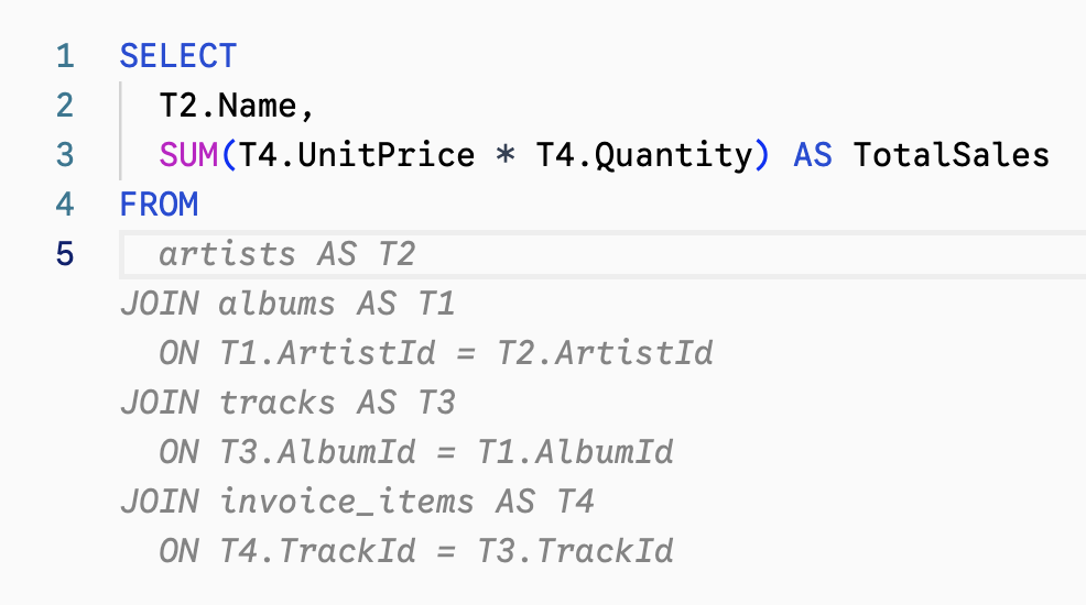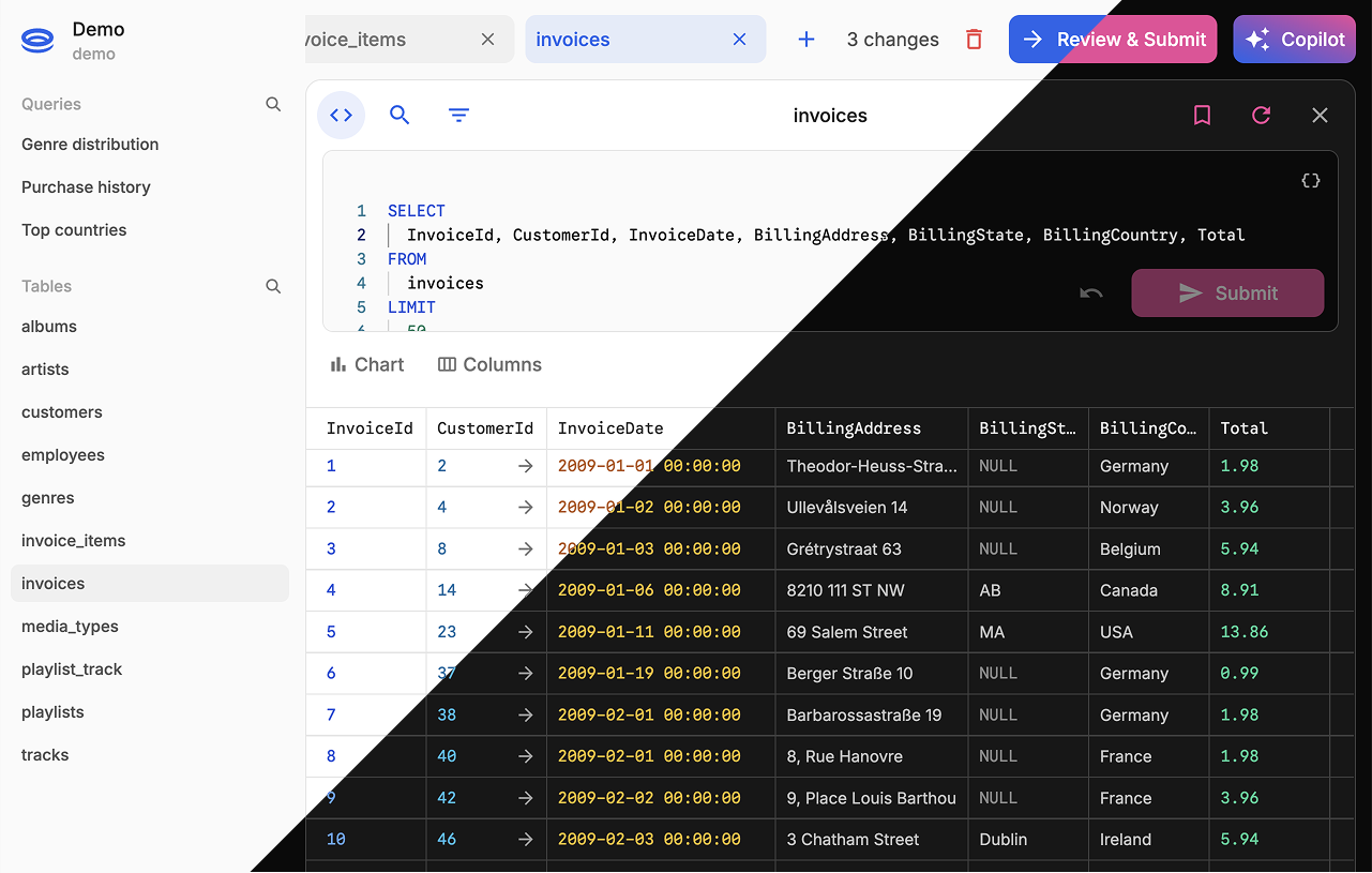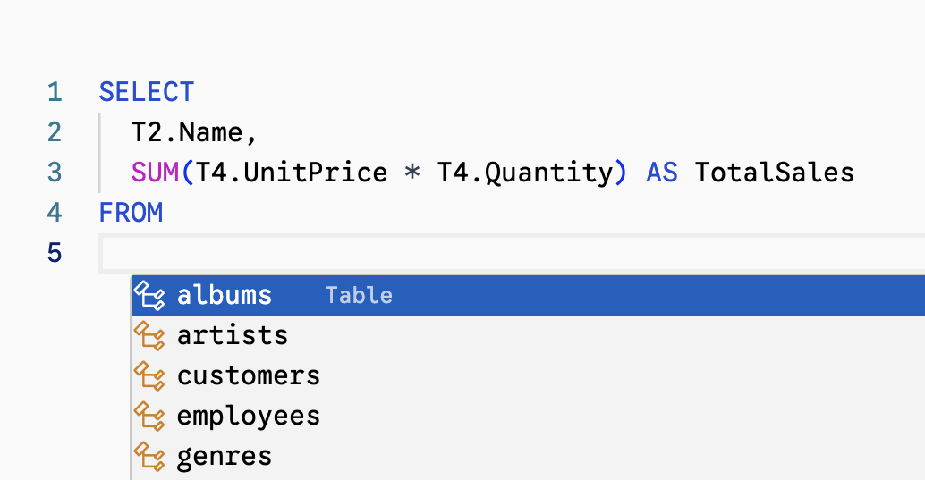Write SQL in a fully featured, VS Code-like editor. Get real-time AI completions and intellisense based on your schema.