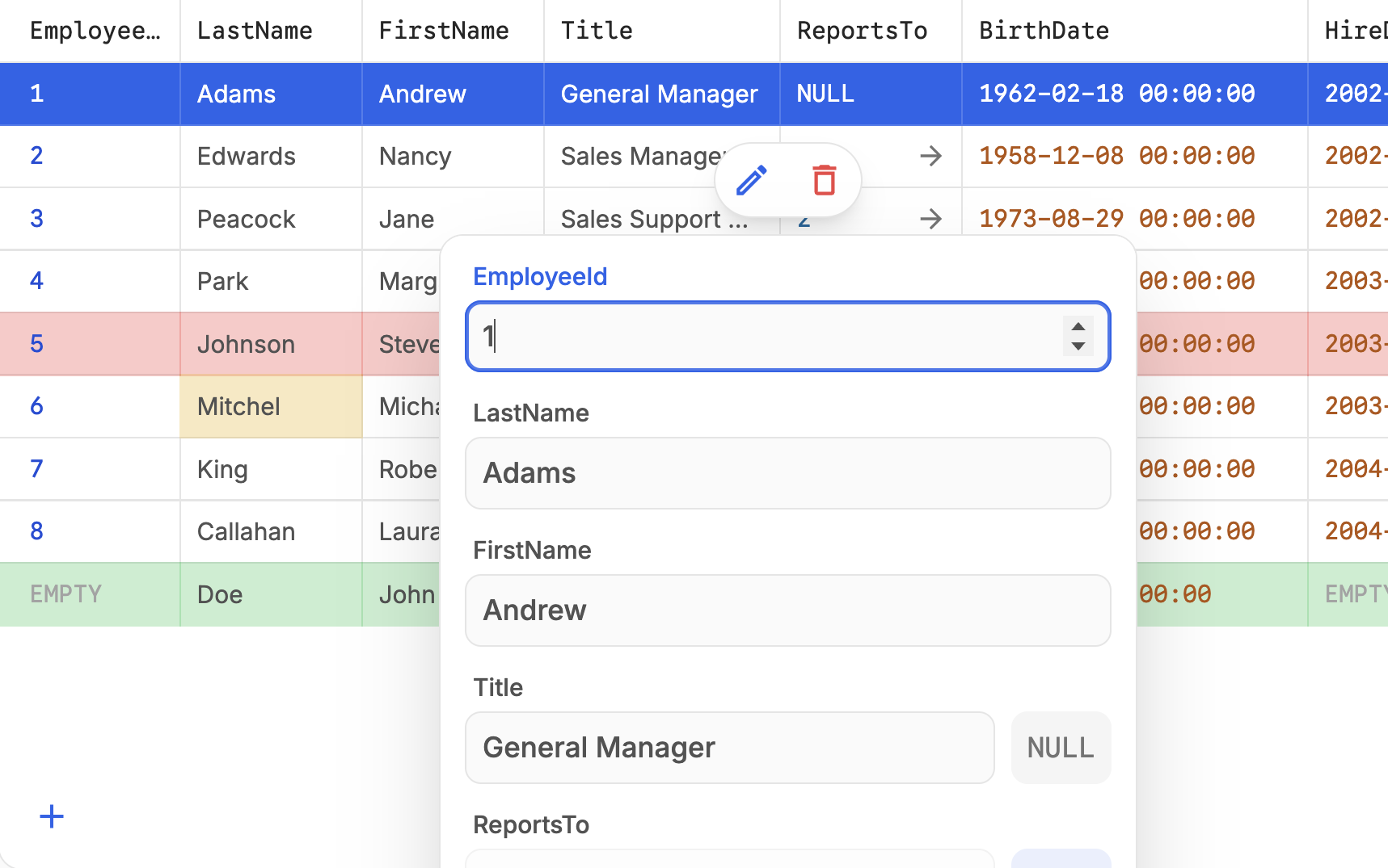 Generate SQL to modify your data with an intuitive user experience. Includes inputs optimized for each data type.